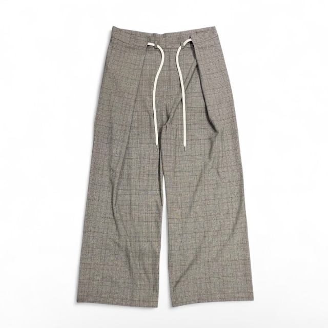 MEGMIURA 25秋冬Collection サイズ:40 脇丈/101cm ウエスト/74cm ヒップ/102.7cm ワタリ/66.4cm 裾まわり/26cm Color:GRAY CHECK ユニフォームのアイコンであるボンタンパンツを、ドレスパンツからインスパイアされたカッティングでアップデートしました。 裾はファスナーで開閉可能で、ファスナーを開けた履き方もおすすめです。 ボトムス用の先染タータンチェック素材に、ニードルパンチで糸を掻き出してツイード調にデザインしています。 ※画像と実際の商品の色味、仕様、加工、素材等が若干異なる場合がございます。 ※表示スペックにつきましては実際の商品と多少の誤差が生じる場合がございます。 ※店頭販売優先のため、店頭で売り切れてしまった場合はやむを得ずキャンセルになってしまう可能性があります。ご了承ください。