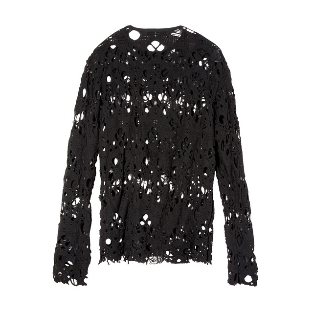 LIBRIO MENDONÇA 26春夏Collection サイズ:F 着丈/65cm 肩幅/40cm 身幅/42cm 袖丈/62cm 裾幅/42cm Color:BLACK ウール素材の糸と溶ける糸で編み上げた素材のウールのみを柄として残した素材のトップス。 フィットサイズ。 ※画像と実際の商品の色味、仕様、加工、素材等が若干異なる場合がございます。 ※表示スペックにつきましては実際の商品と多少の誤差が生じる場合がございます。 ※店頭販売優先のため、店頭で売り切れてしまった場合はやむを得ずキャンセルになってしまう可能性があります。ご了承ください。
