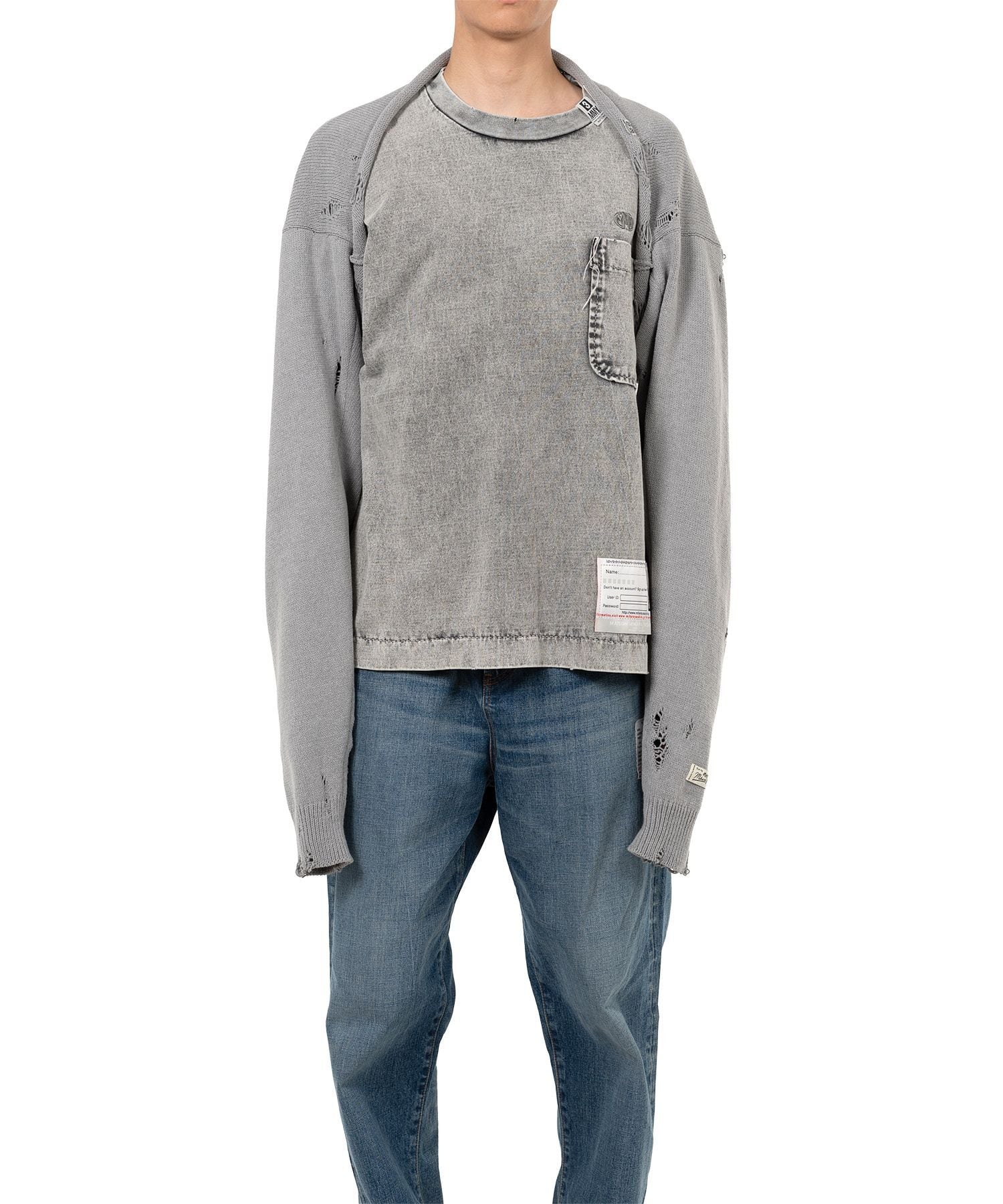 ダメージ加工を施したニットの袖をスカーフにしたデザイン。