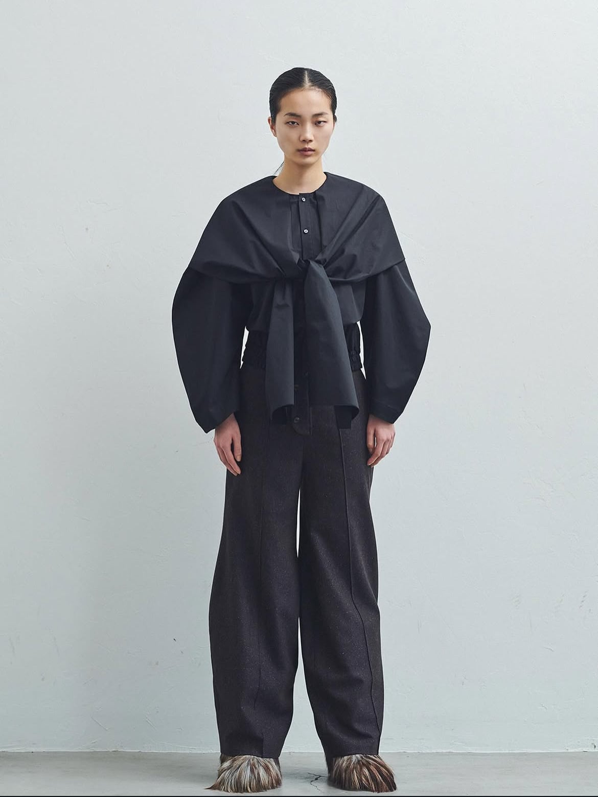 公式LOOKのように前で結んでも、フードのように被ることも可能。
