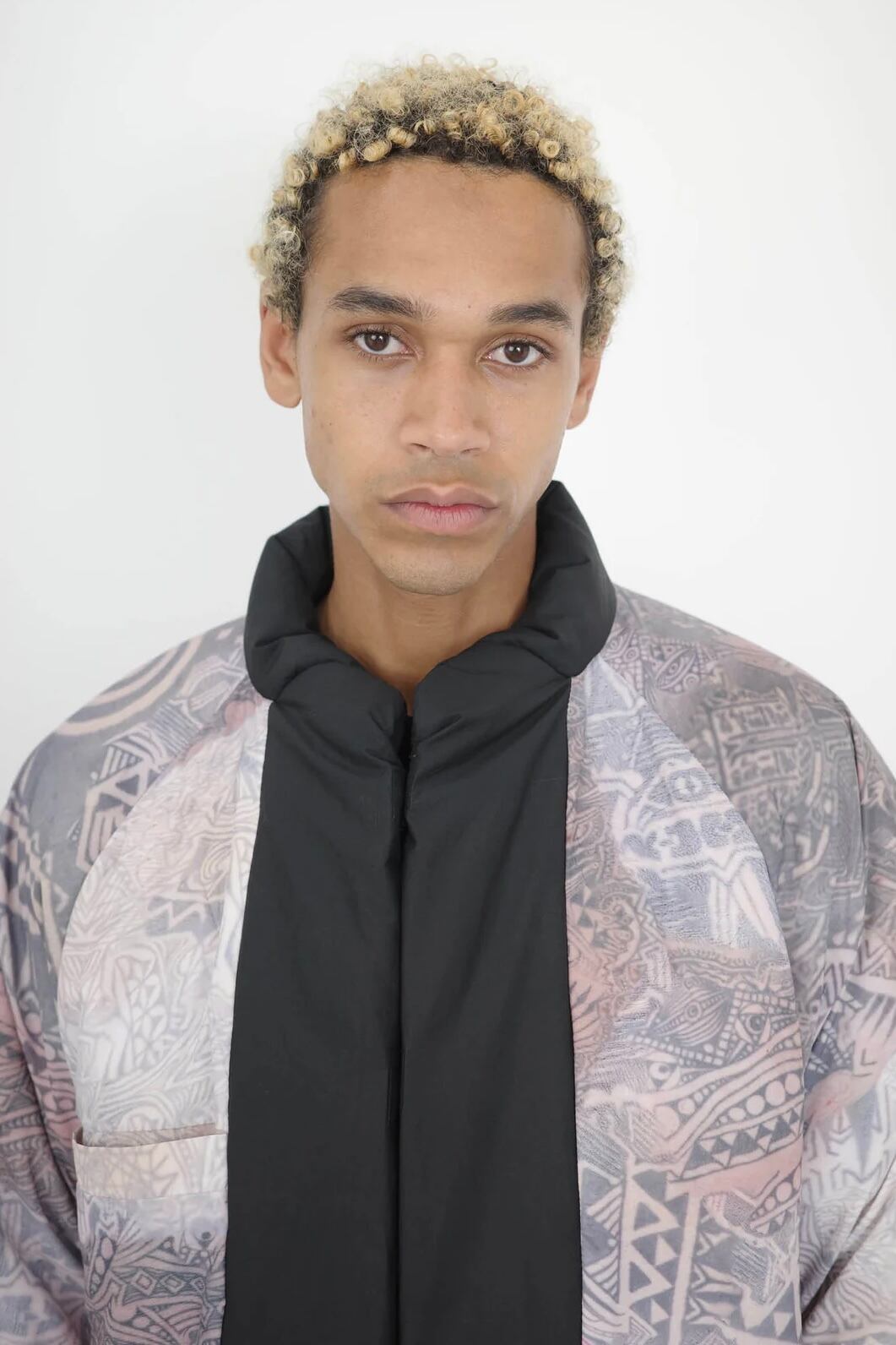 フロントにマグネットボタン、イギリス人アーティストキム・ロートンによるグラフィック総柄裏地。