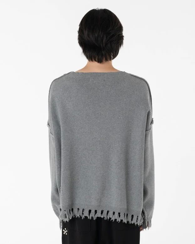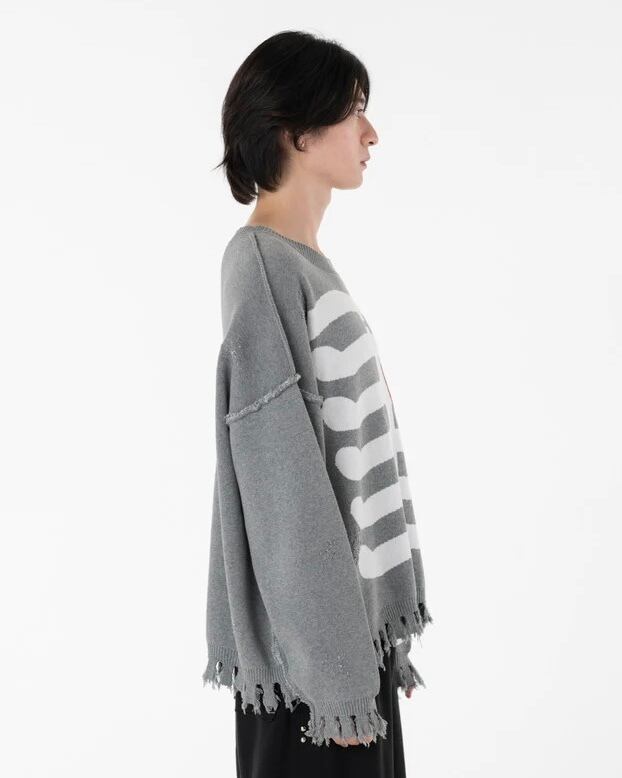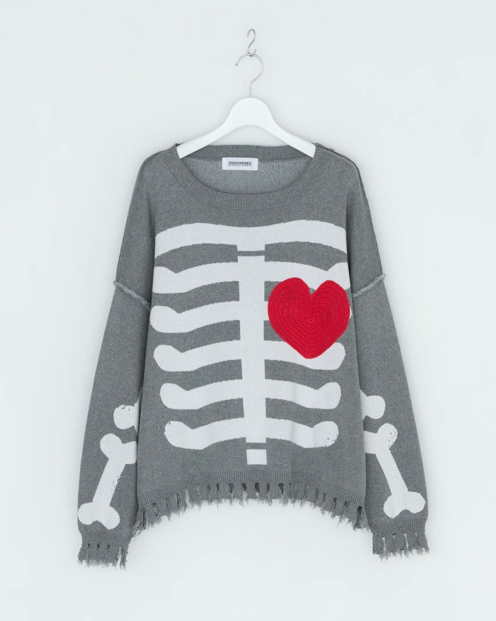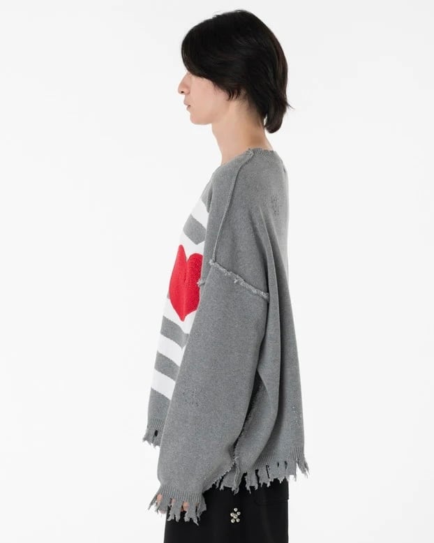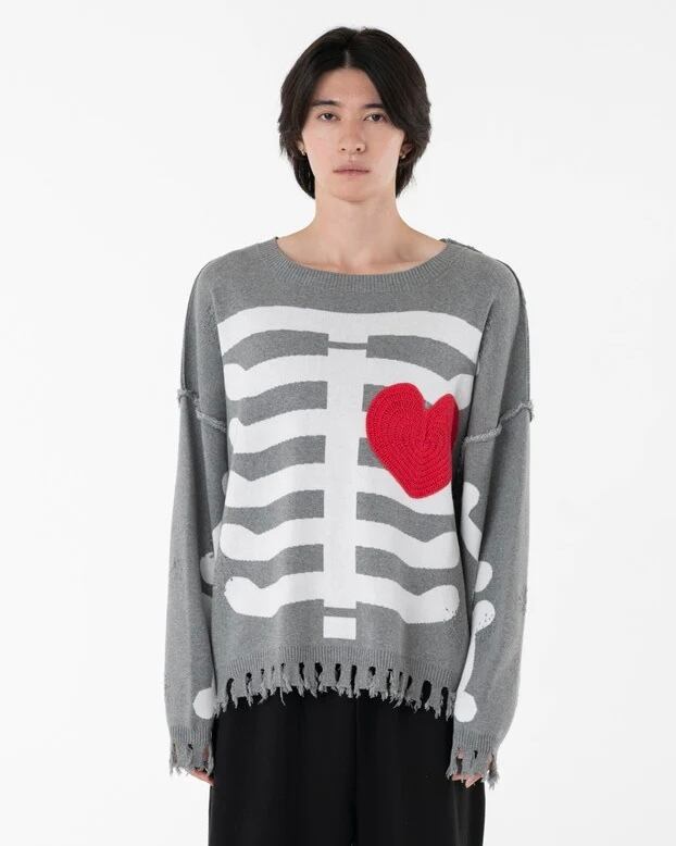 ⾝幅が広めで着丈短め、スカルジャガード、ハートクロシェット、ダメージ加⼯と楽しさ溢れるアイテム。