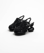 イントレチャート編みと特徴的なダックヒールを組み合わせたデザインサンダル。