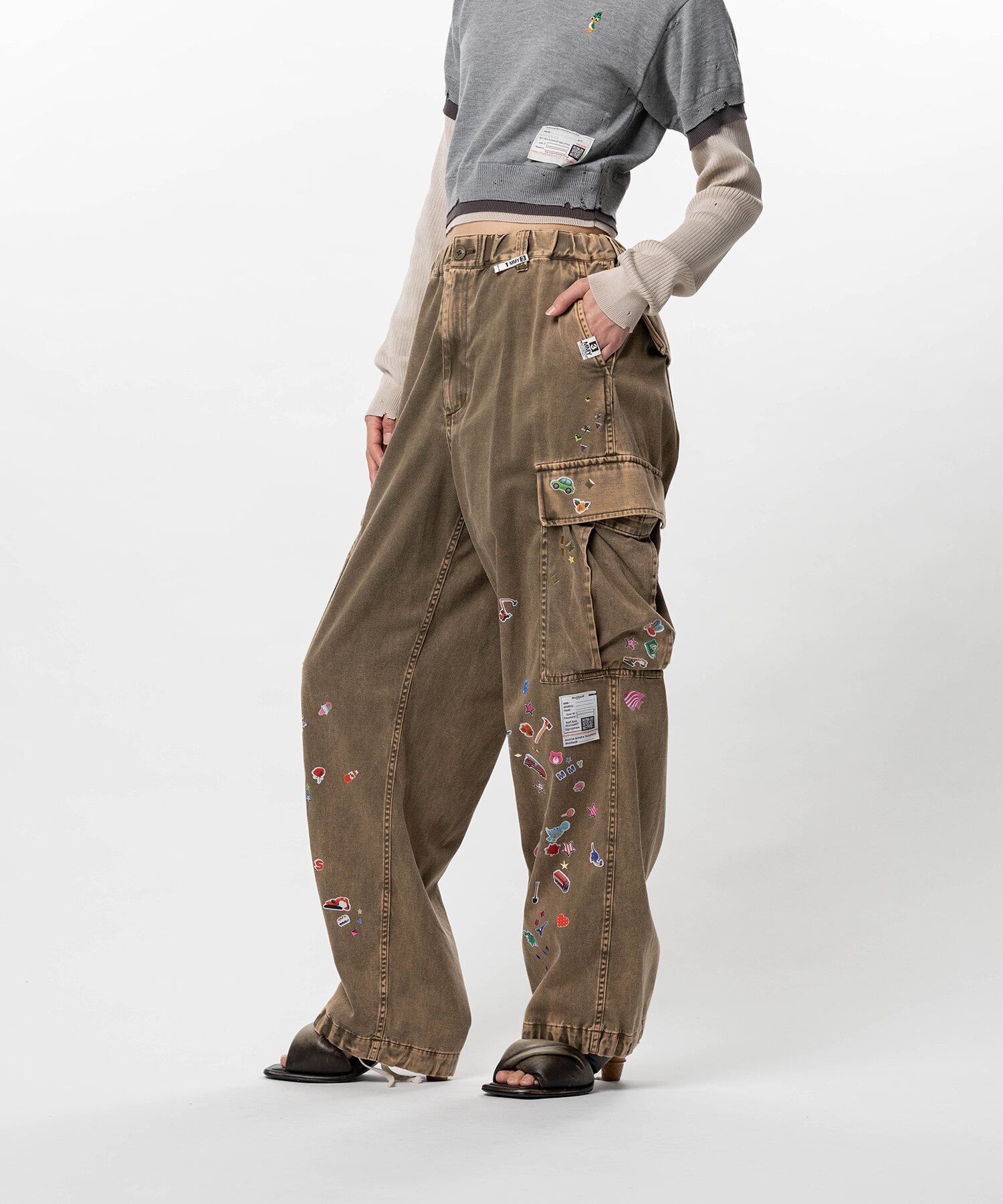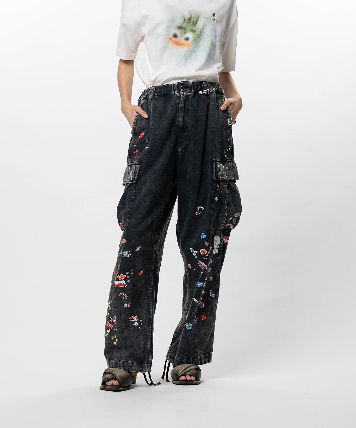 全体にステッカープリントが程されたミリタリー パンツ。