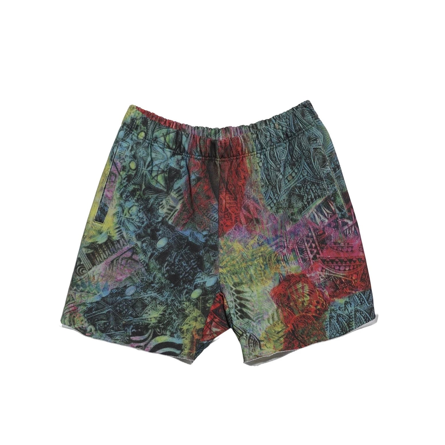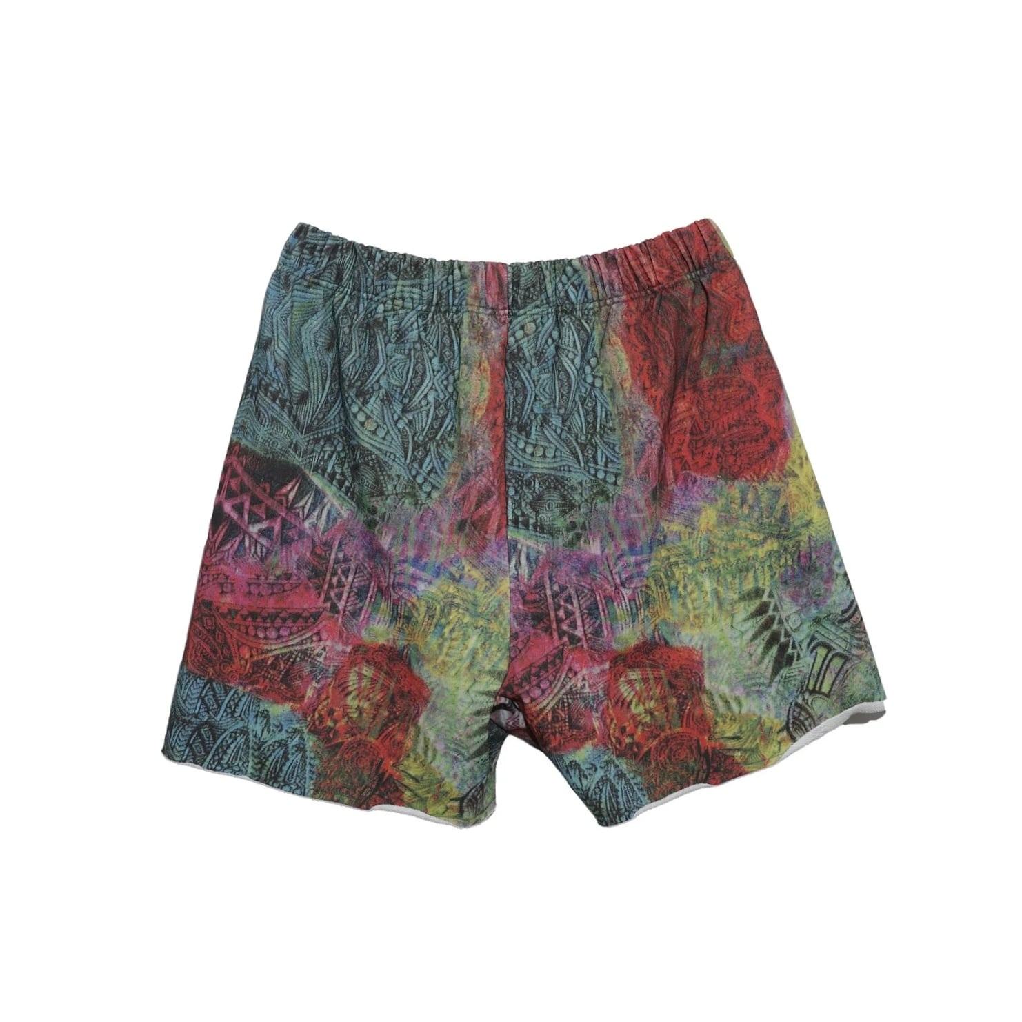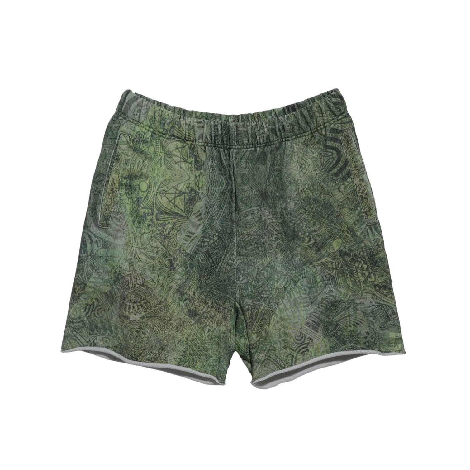 オープンエンド糸を使用した14オンスの厚手スウェット裏毛ループ(オリジナルボディ) 生地全体にプリント、サイドポケット、ウエスト内側にドローコード、裾にドローコード、裾は断ち切り仕様。