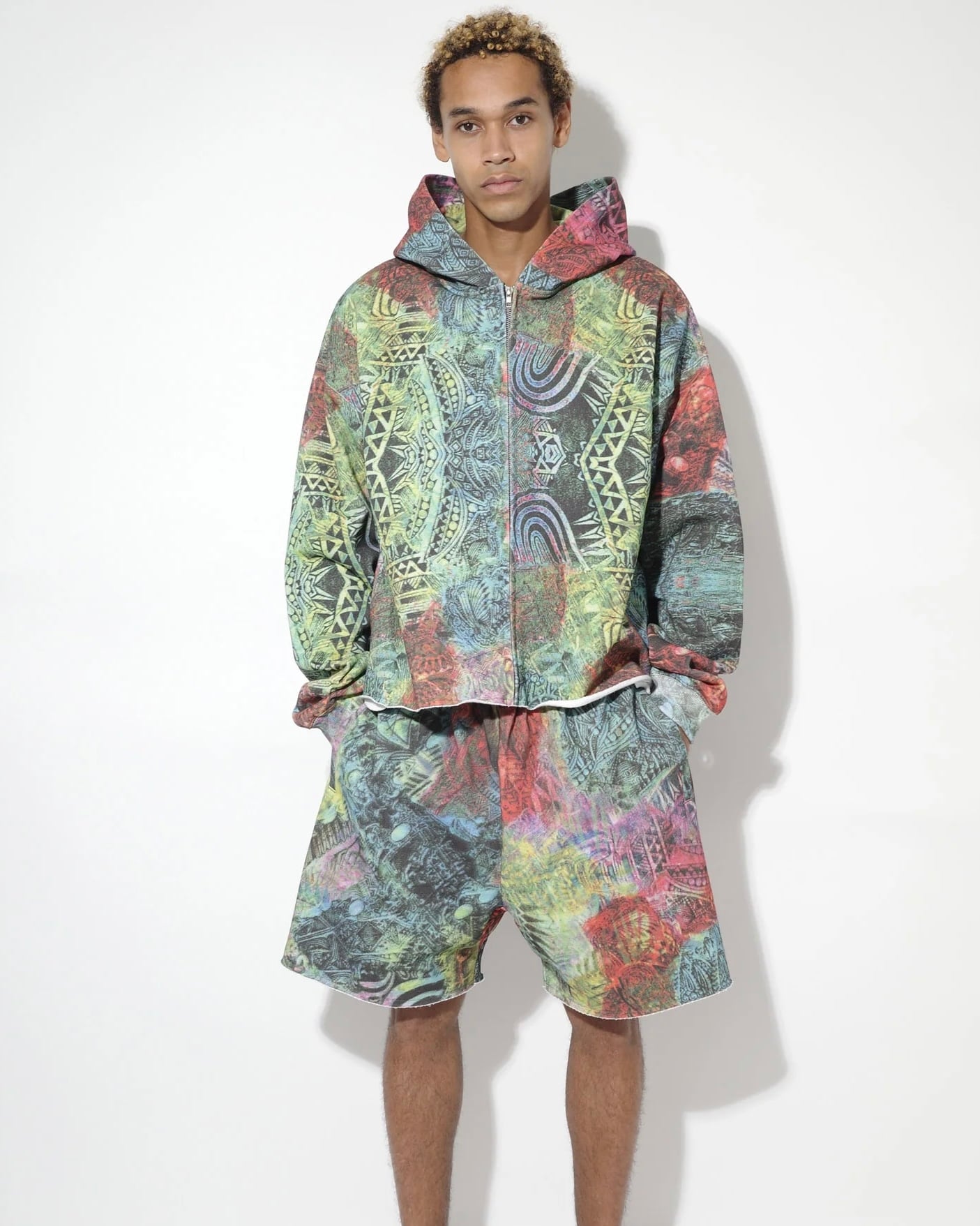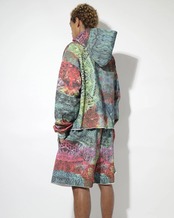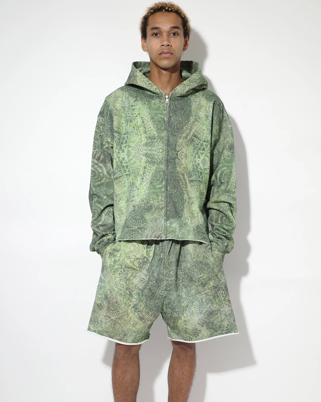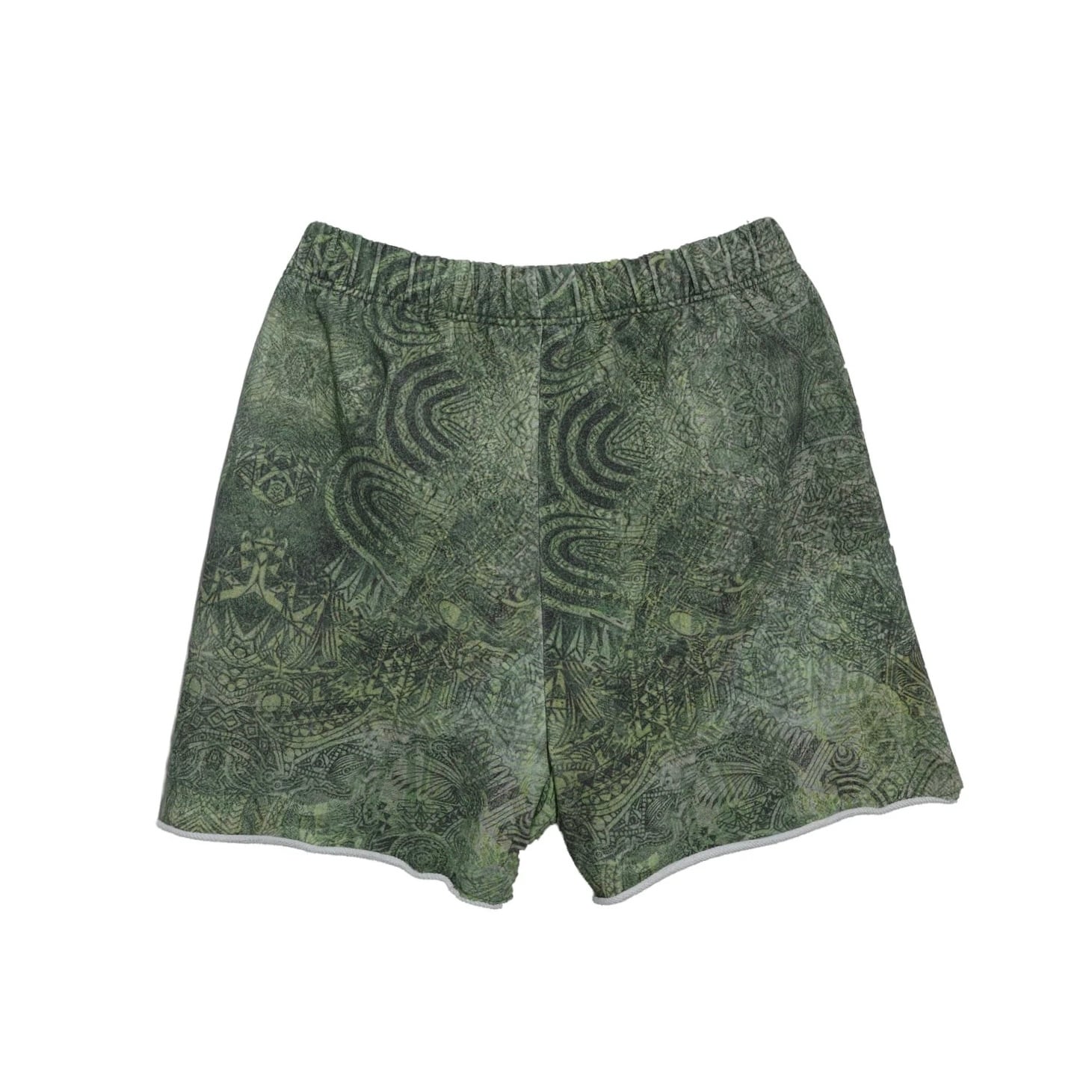 オープンエンド糸を使用した14オンスの厚手スウェット裏毛ループ(オリジナルボディ) 生地全体にプリント、サイドポケット、ウエスト内側にドローコード、裾にドローコード、裾は断ち切り仕様。