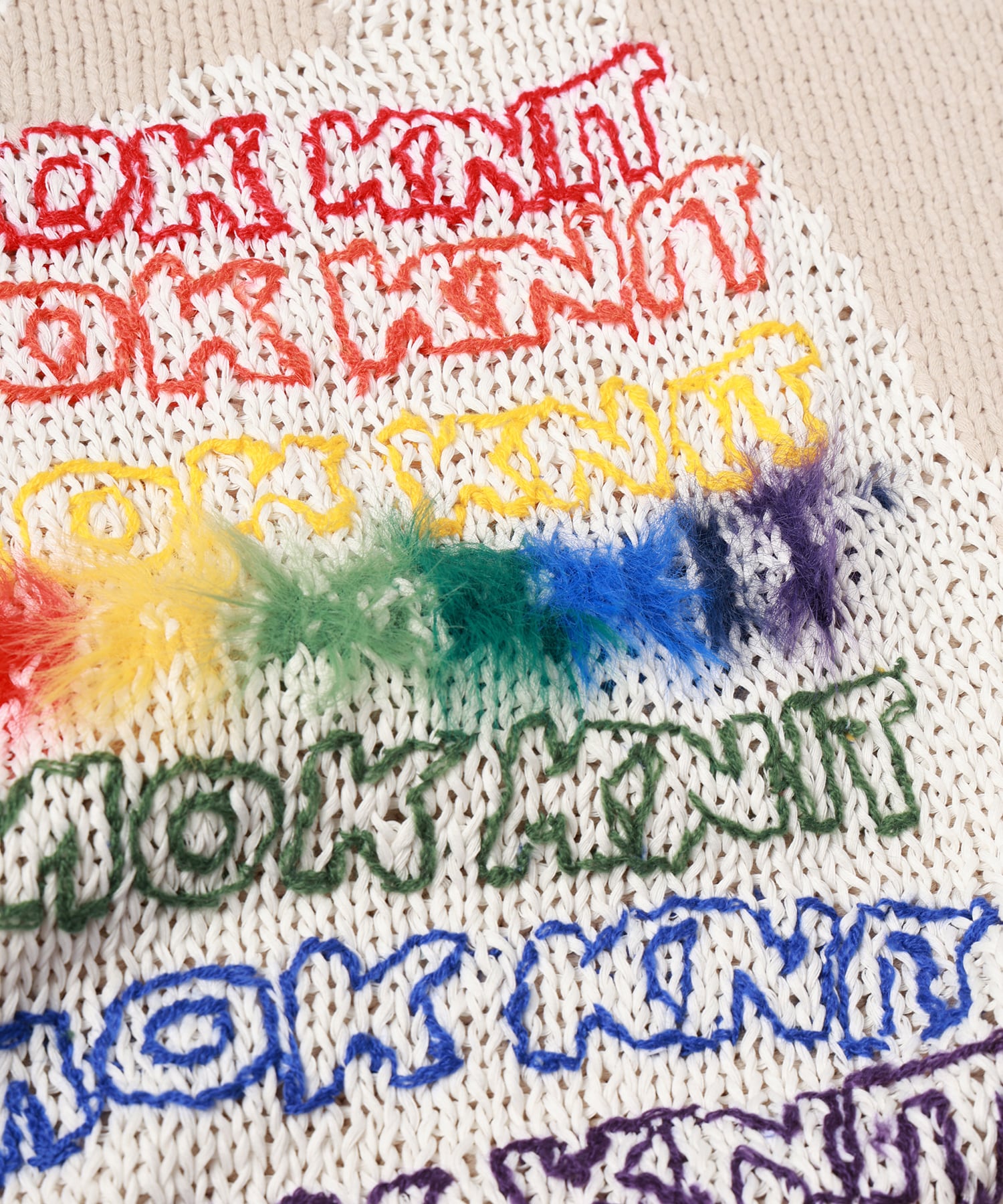デザインモチーフ部分には某エコバッグのモチーフをベースに、6色手刺繍と毛足の長い糸を使用して立体的な表現も取り入れた特別や一着。