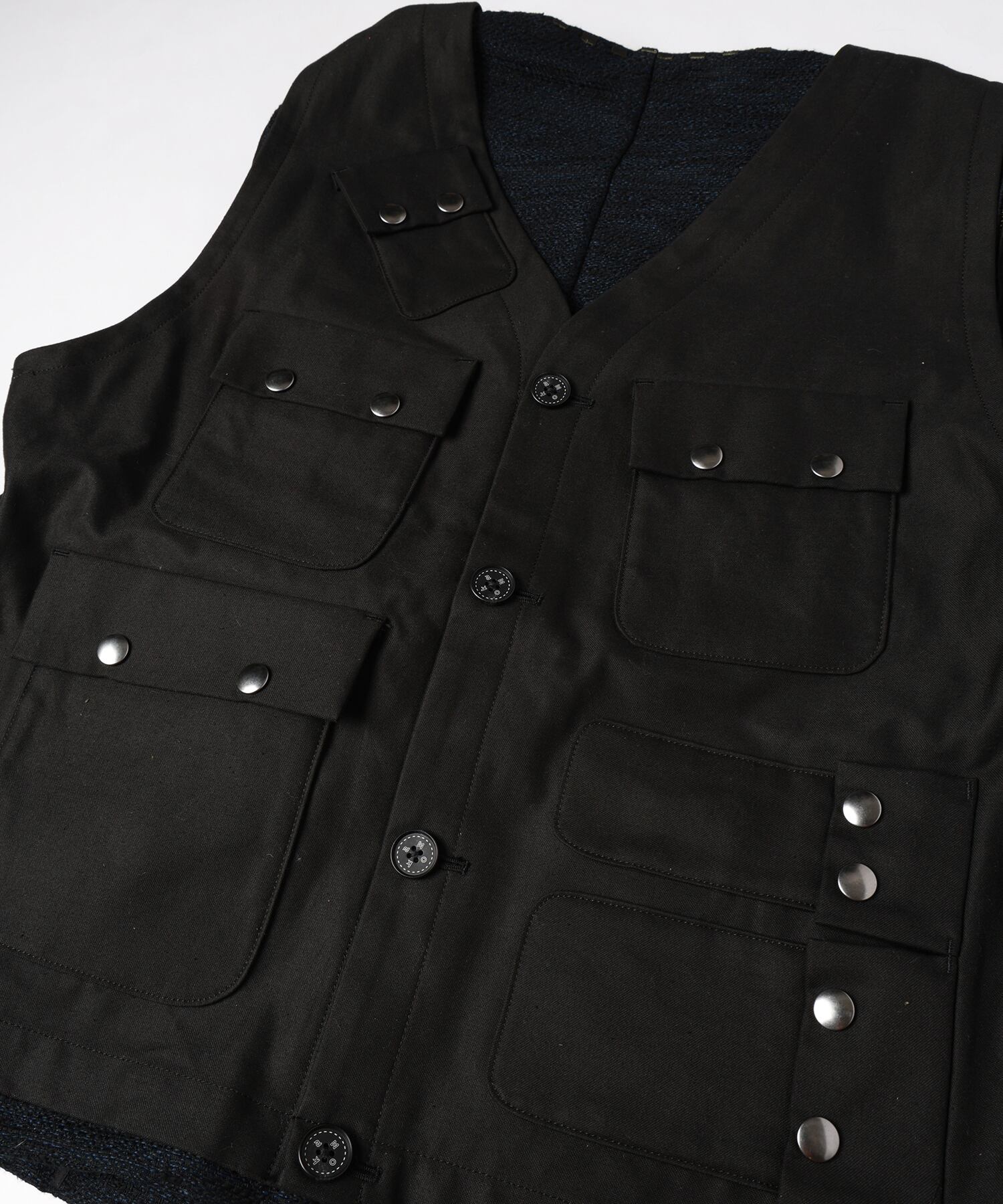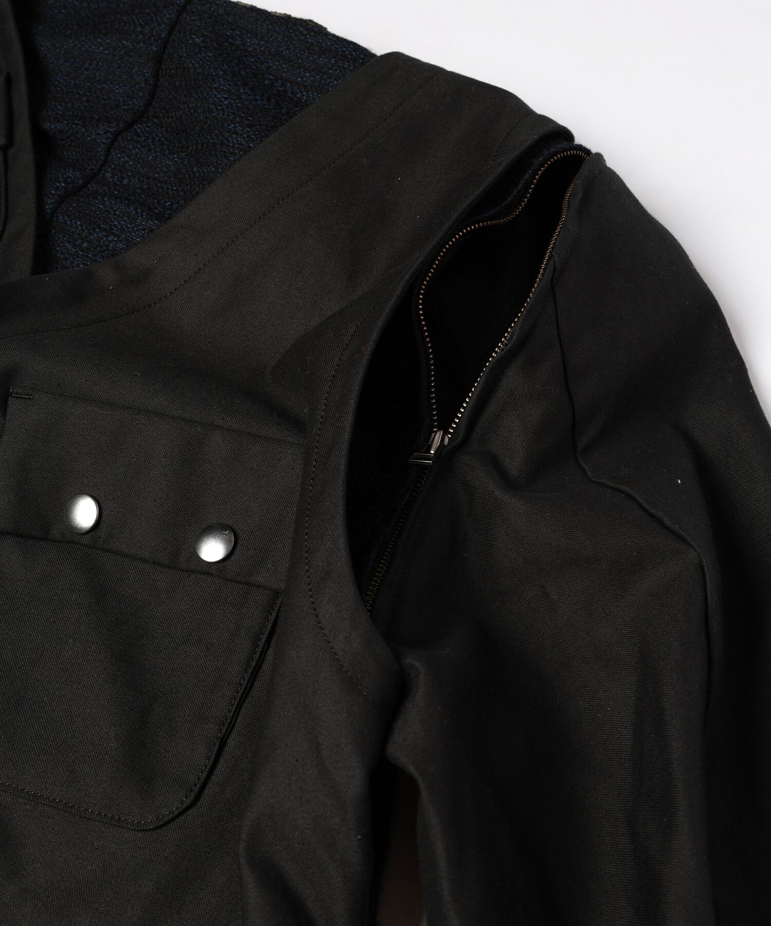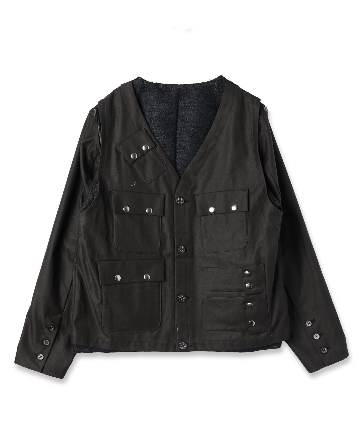 フロントはスラブジャガードのノーカラージャケット、バックにはU.S.AIR FORCEのC-1のデザインベスト仕様になり、どちらでも着用可能で、バック部分の袖ぐりにはファスナー仕様がありベストでも長袖でも着用可能なデザイン。