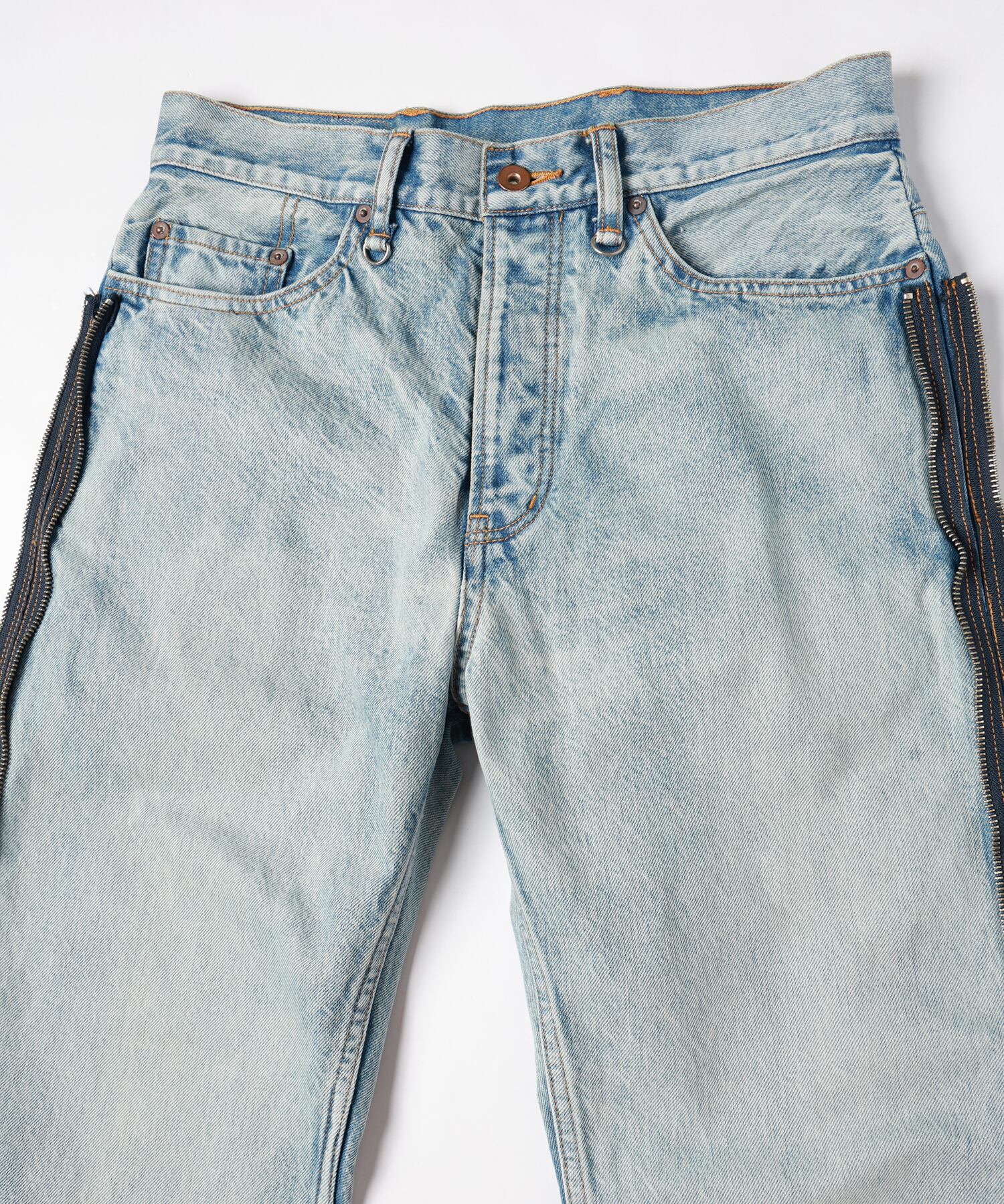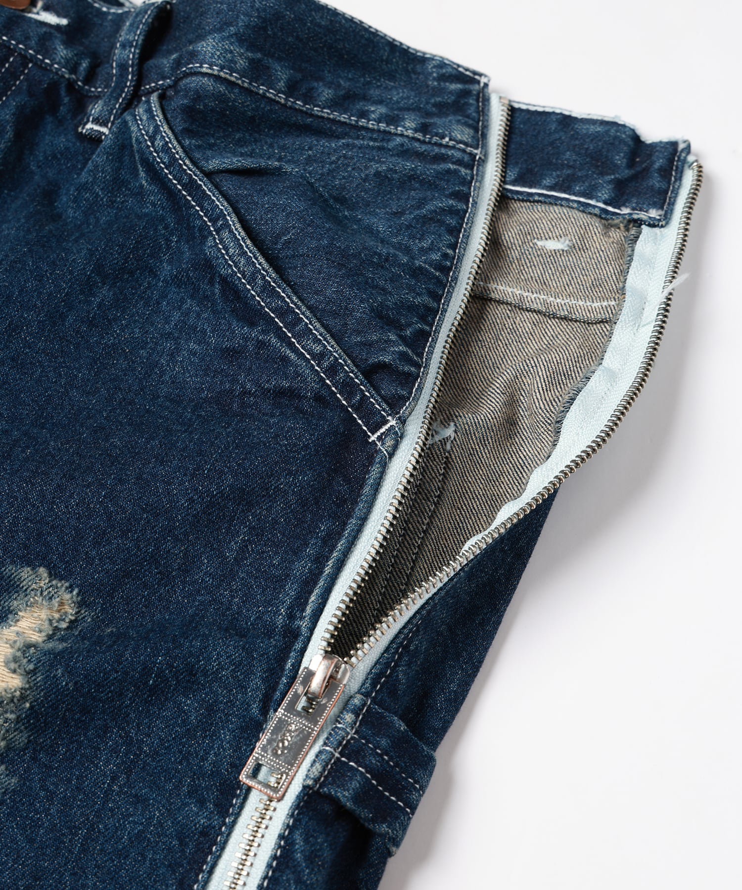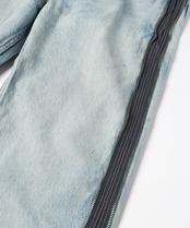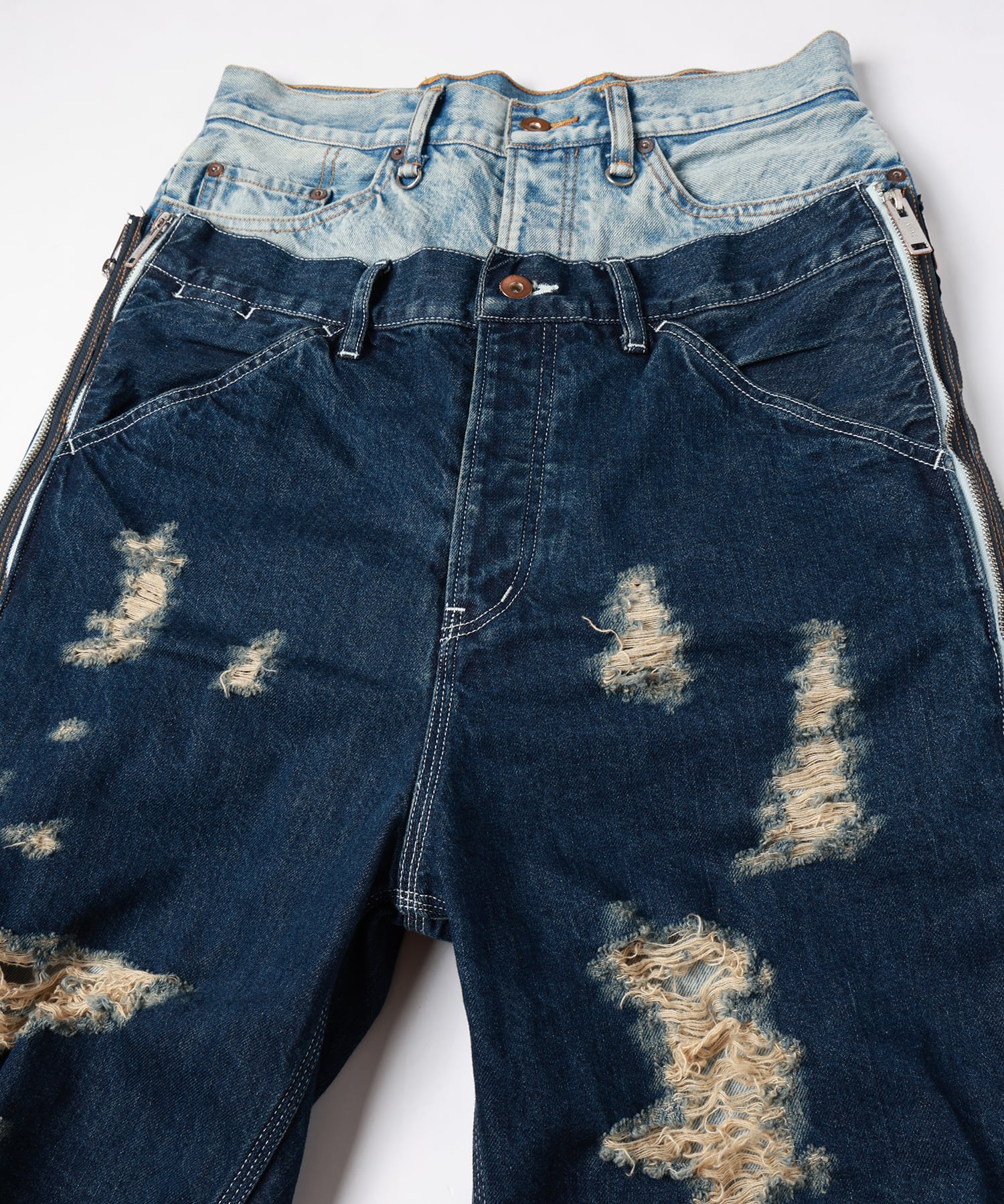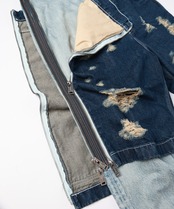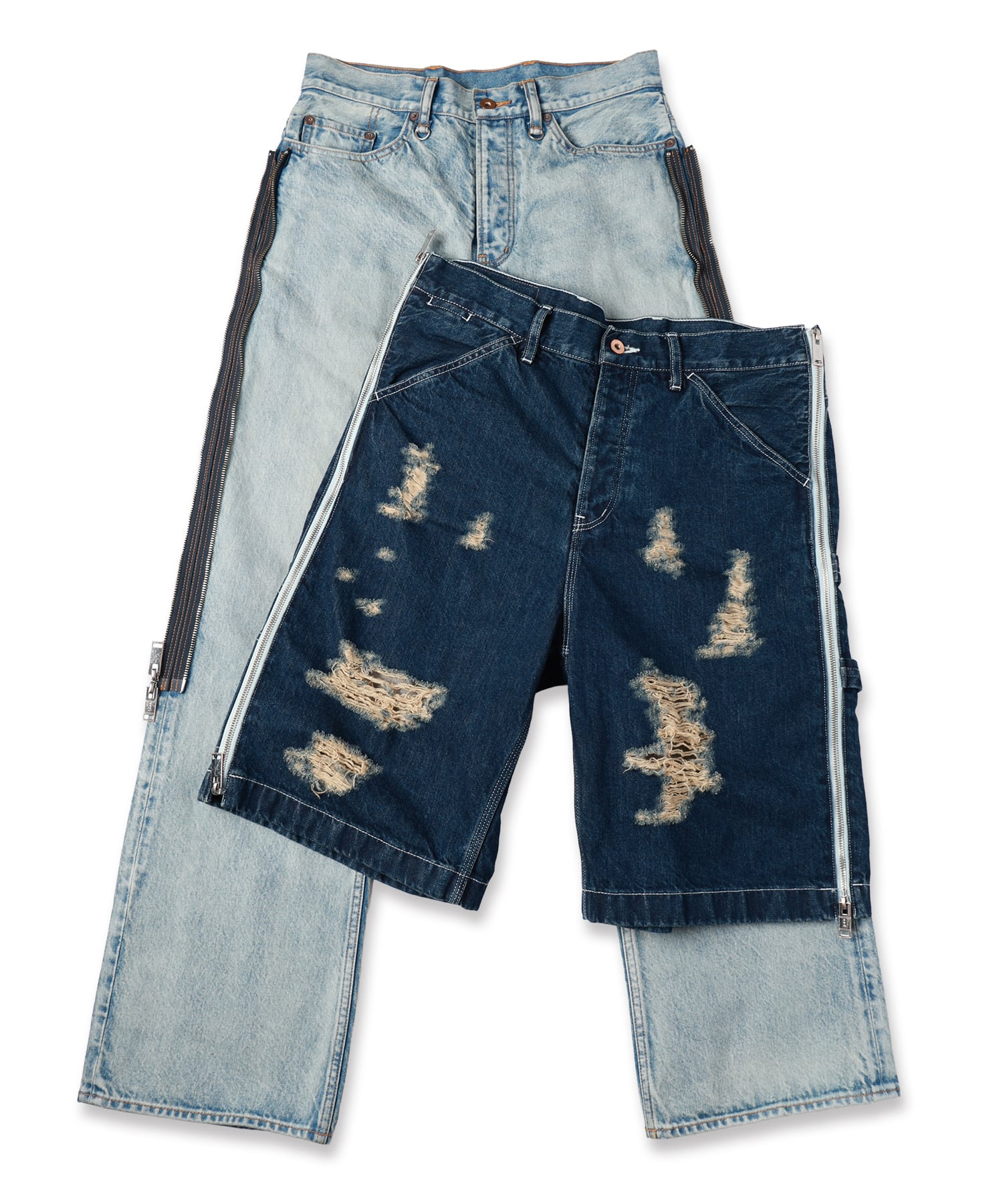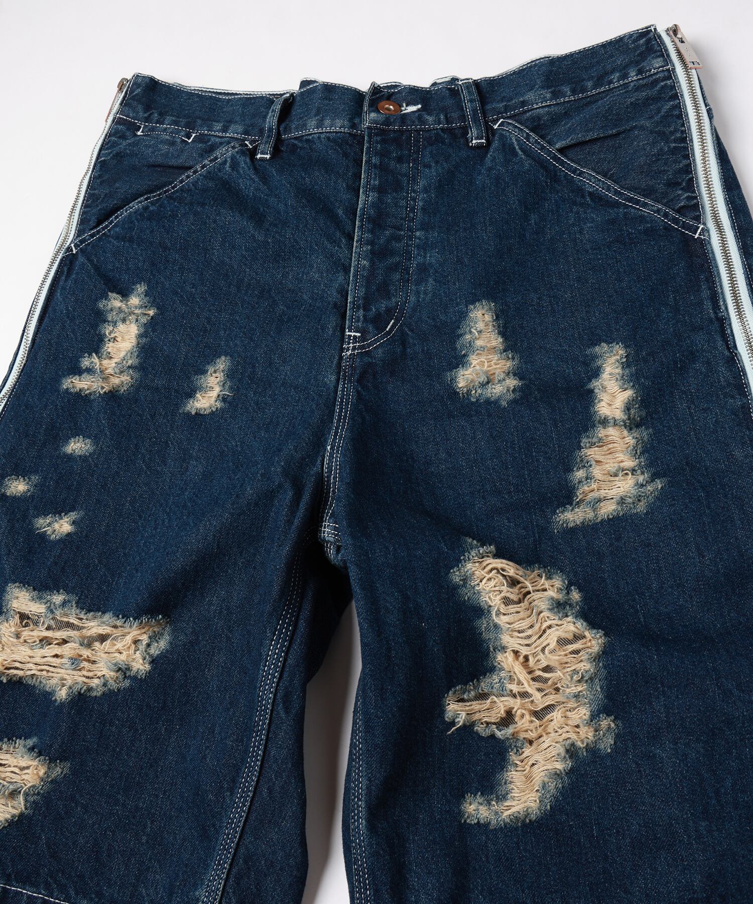 上側にはペインターパンツをベースにブリーチ、オーバーダイ、ブラスト、シェービング+ヒゲを加えダメージ加工を施しファスナーを取り外してショーツとしても着用可能となります。