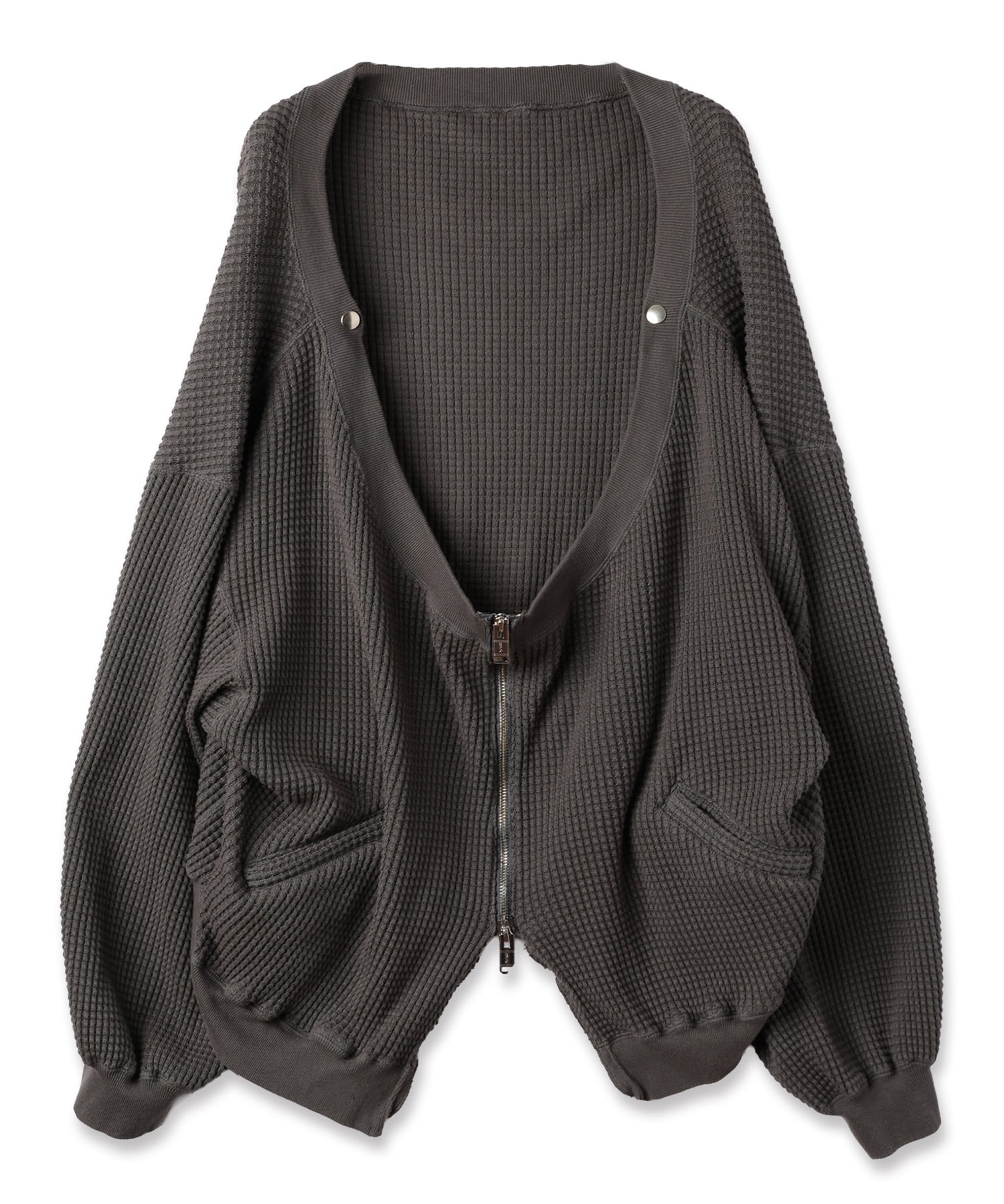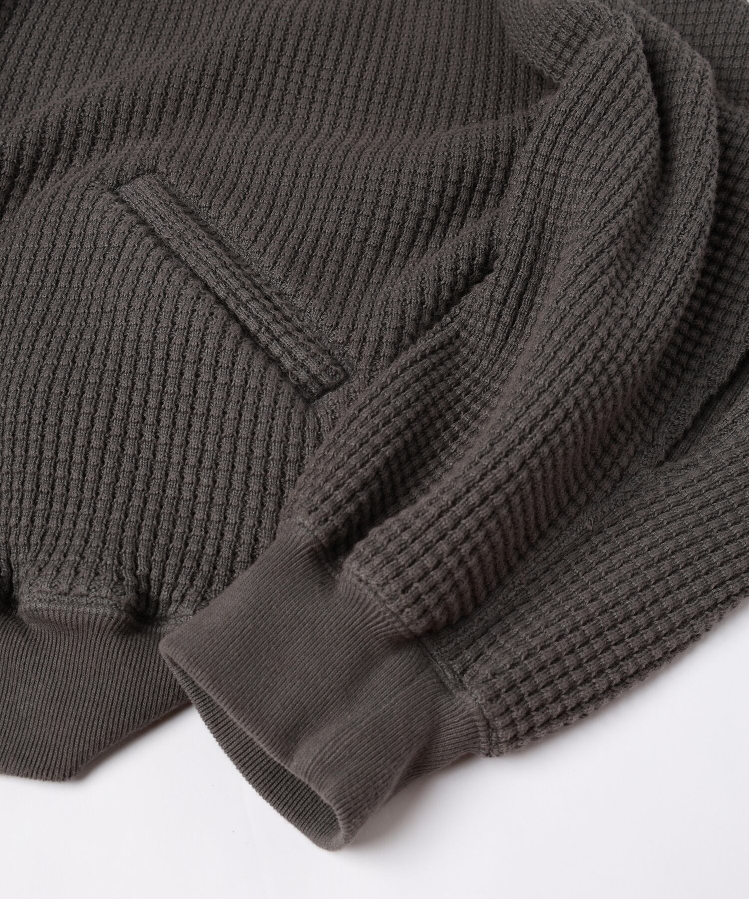 上側には太番手の糸を引き揃えて編み立てたヘビーワッフル生地をベースにシルエットはざっくりと開いた前下がりはレイヤーとしてどのアイテムにも合うように設計されたデザインとなります。