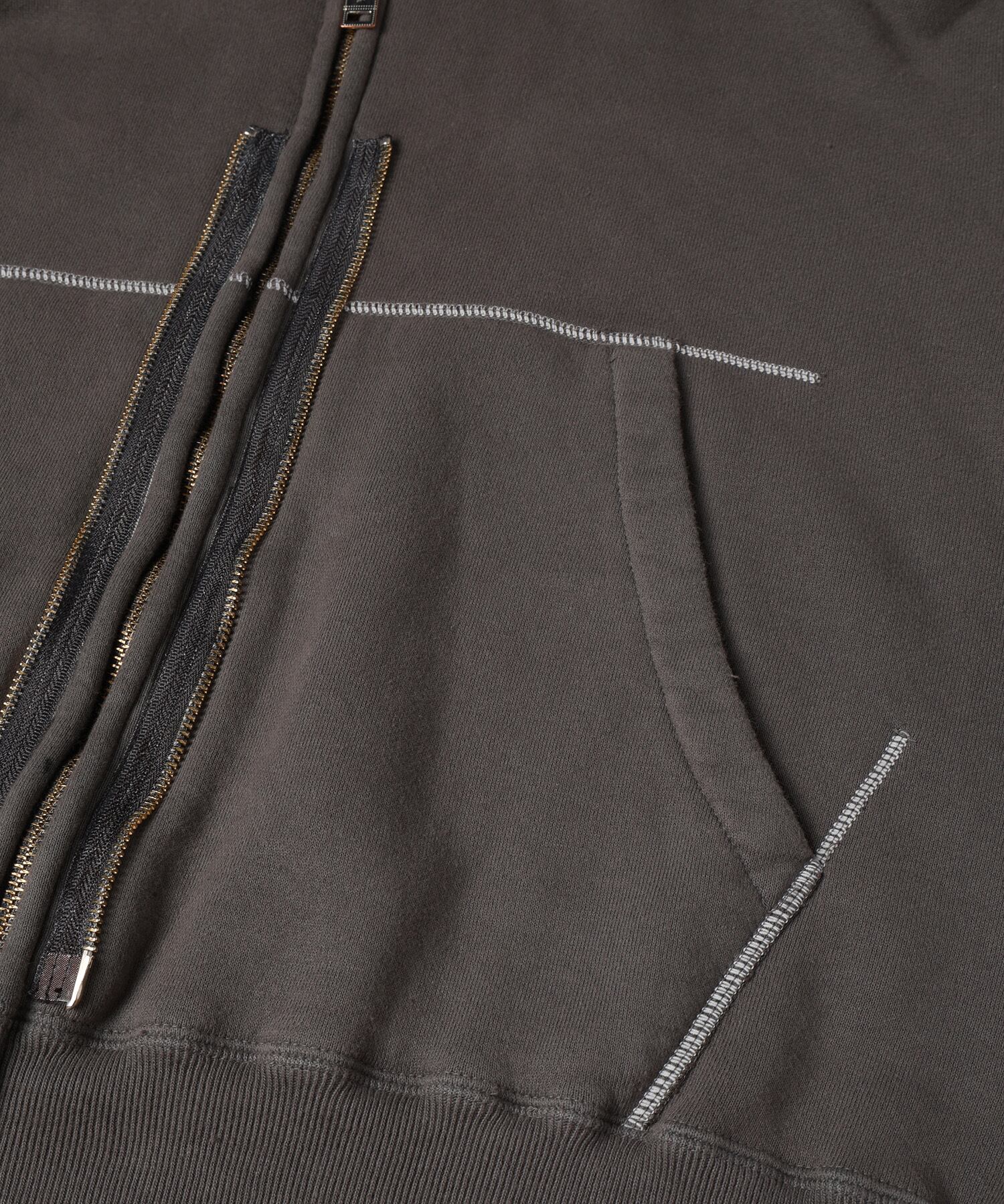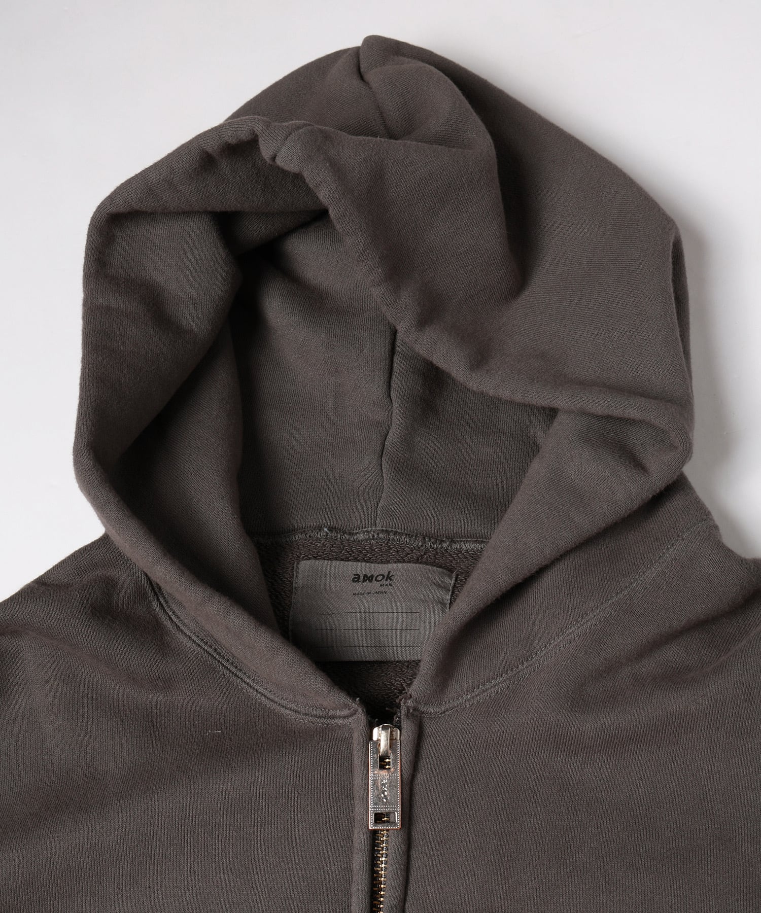 下側には30/7 French Terryの裏毛生地のショート丈のフーディで上下ともに製品ピグメント加工を施した一着。