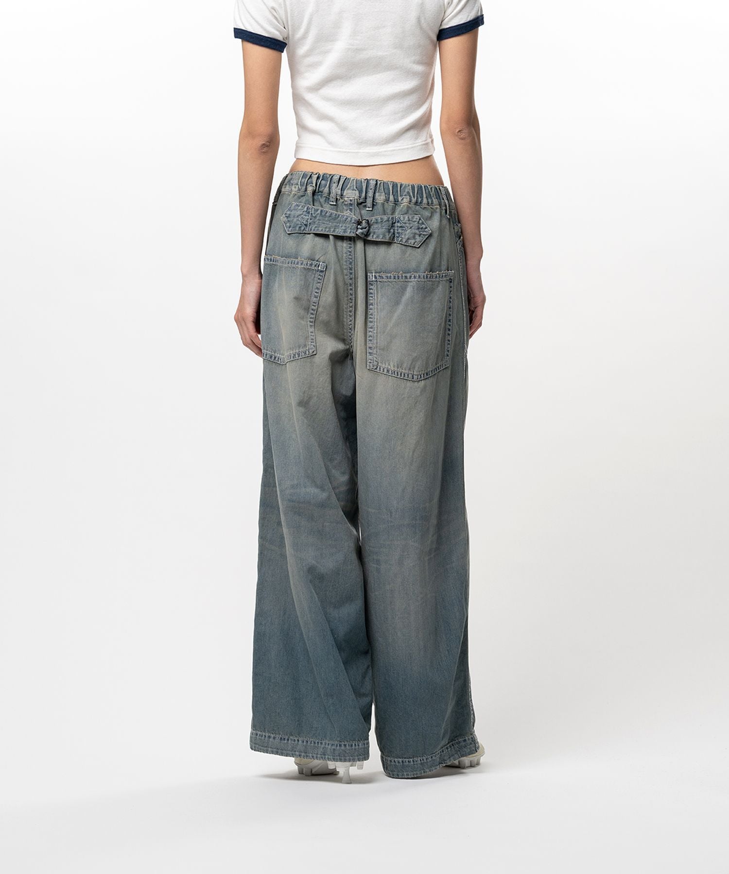 ライトデニム生地に色落ち加工を施したワイドパンツ。
