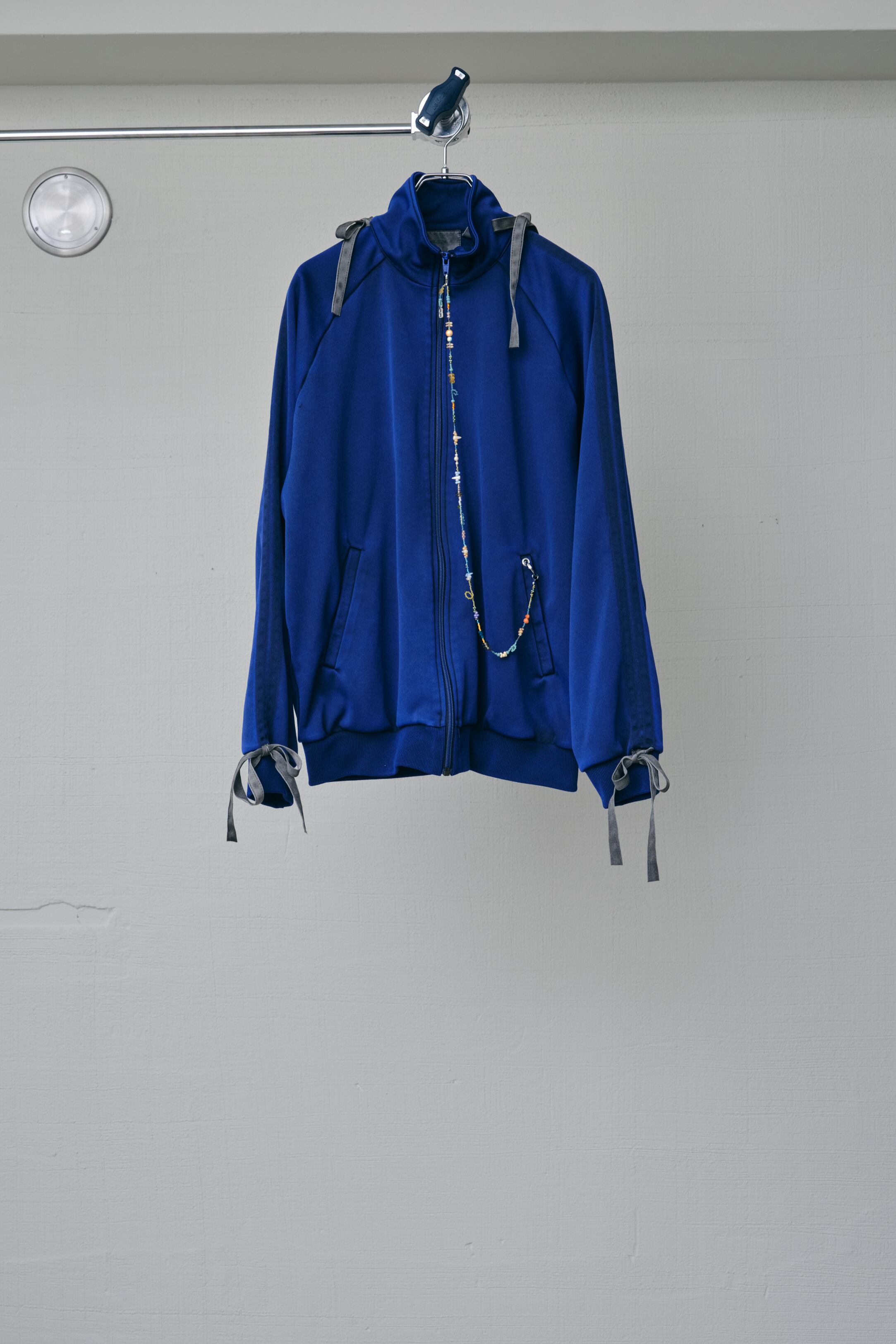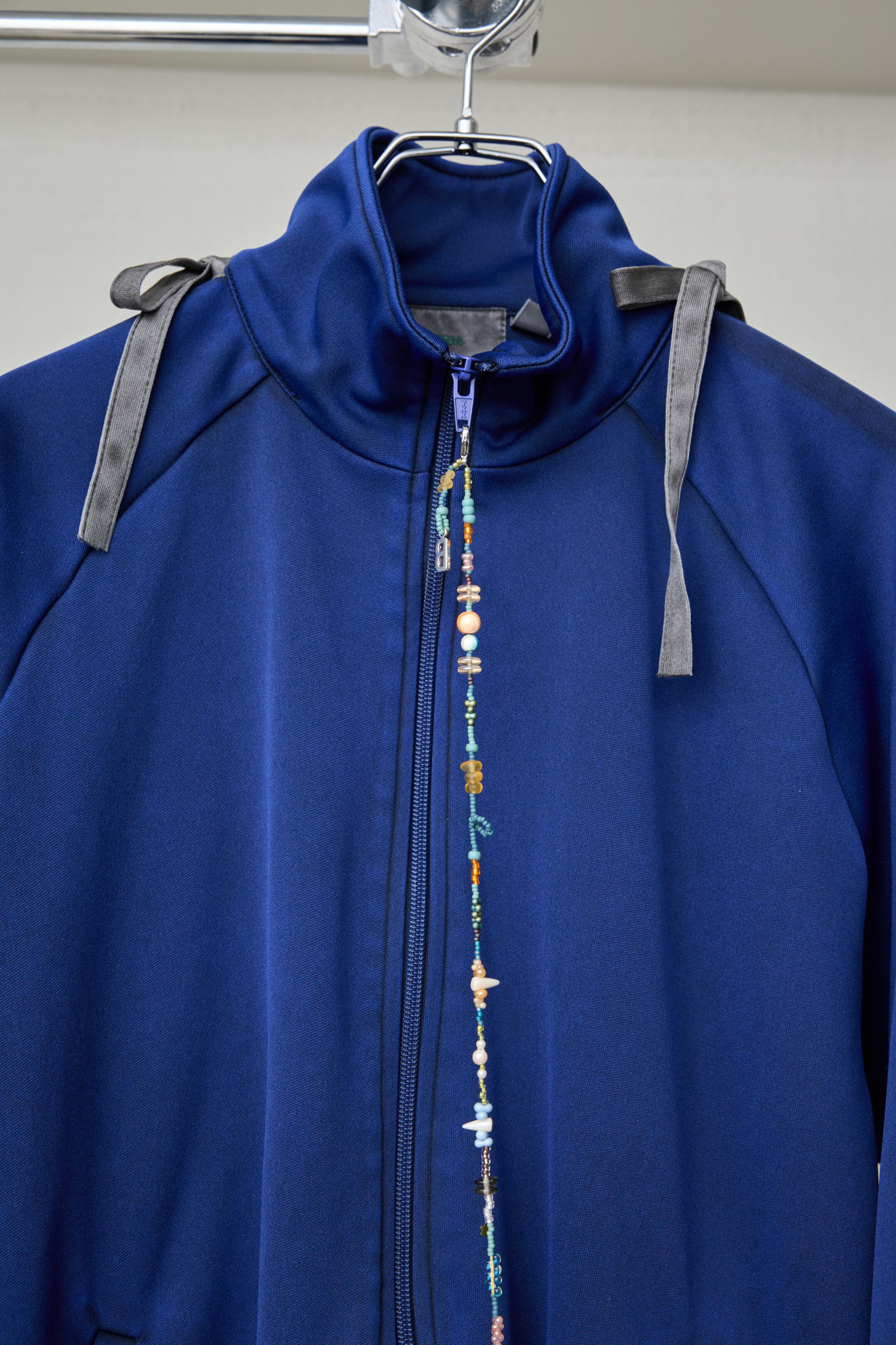 ワイルドな表情を持つ顔料染めのトラックジャケットに、BUBBLE MONEYのハンドクラフトビーズが優しく、華やかなアクセントを添えます。